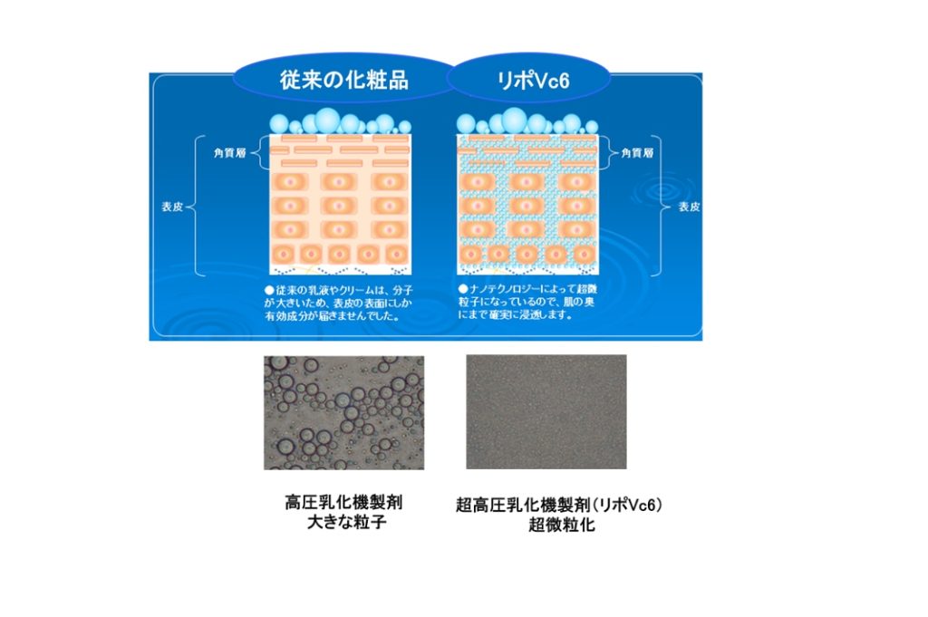 そのリポソームの技術を使用した化粧品は、お肌の角質層の奥深くまで到達させ効果を発揮させたい美容成分をナノサイズまで超微粒子化し、成分が細胞と細胞の微細な隙間をすり抜けられるほど極小粒子にすることができるため、角質層の深部にある基底層や真皮層まで到達し効能効果を発揮することが可能です。